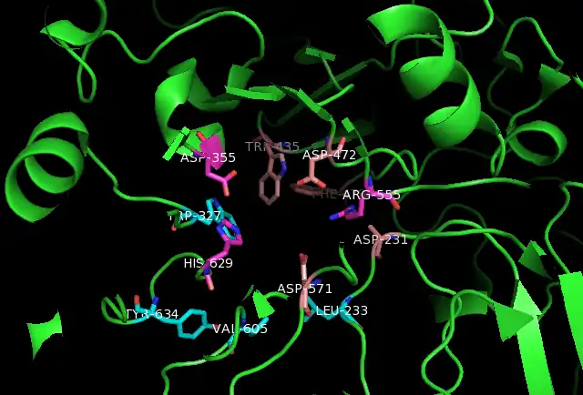 - Kotalonal, the inhibitor: It interacts with the catalytic nucleophile Asp472 and acid base catalyst Asp571. In addition, ntSI residues His629, Asp355, Arg555, Asp231, Trp435, and Phe479 bind to the substrate.[15]