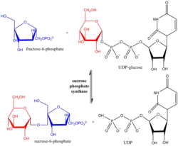 - 1 2 3 Huber SC, Huber JL (June 1996). "ROLE AND REGULATION OF SUCROSE-PHOSPHATE SYNTHASE IN HIGHER PLANTS". Annual Review of Plant Physiology and Plant Molecular Biology. 47: 431–444. CiteSeerX 10.1.1.473.6911. doi:10.1146/annurev.arplant.47.1.431. PMID 15012296.