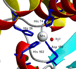 ![]() Active site of Human Manganese SOD, manganese shown in purple[9] |