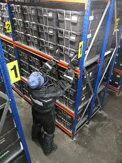 The seeds are stored in sealed three-ply foil packages and then placed into plastic tote containers on metal shelving racks.[53] The storage rooms are kept at −18 °C (−0.4 °F). The low temperature and limited access to oxygen will ensure low metabolic activity and delay seed ageing. The permafrost surrounding the facility will help maintain the low temperature of the seeds if the electricity supply fails.[54][43]