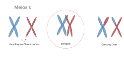 This is not to be confused with mitosis. Mitosis also has prophase, but does not ordinarily do pairing of two homologous chromosomes.[4] In contrast to the mitosis cycle, during meiosis, the number of chromosomes is reduced by half to create haploid gametes; this reduction is called Haploidization; after fertilization, diploidy is restored. Homologous chromosomes – two copies inherited from each parent – recognize one another and pair before reductional segregation, which is essential for crossover recombination and forms chiasmata,[5] a stable physical connection that hold homologous chromosomes together until metaphase.[2] In most species, every homologous chromosome experiences at least one meiotic crossover referred to as the obligate crossover.[5]
