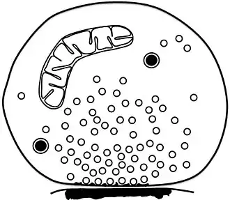 ![]() Schematic of isolated synaptosome with numerous small synaptic vesicles, two dense-core vesicles, one mitochondrion and a patch of postsynaptic membrane attached to the presynaptic active zone | |