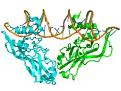 ![]() Crystallographic structure of the TBX3 protein dimer (cyan and green) complexed with DNA (brown) based on the PDB: 1h6f coordinates. | |||||||||||