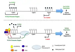 - ↑ Arab K, Park YJ, Lindroth AM, Schäfer A, Oakes C, Weichenhan D, Lukanova A, Lundin E, Risch A, Meister M, Dienemann H, Dyckhoff G, Herold-Mende C, Grummt I, Niehrs C, Plass C (August 2014). "Long noncoding RNA TARID directs demethylation and activation of the tumor suppressor TCF21 via GADD45A". Molecular Cell. 55 (4): 604–14. doi:10.1016/j.molcel.2014.06.031. PMID 25087872.