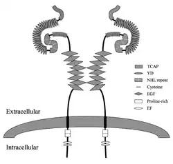 The extracellular C terminal domain is composed of a linker region, EGF-like repeats and then a globular domain. The linker region is made up of ~200 amino acid residues and is found immediately distal to the transmembrane domain. This is followed by eight phylogenetically conserved tenascin C-type EGF-like repeats, which features the uniquely conserved replacement of a single cysteine in repeats 2 and 5 in place of the original tyrosine and phenylalanine residues respectively. Since cysteines are susceptible to forming disulfide bonds, the single cysteines at the EGF-like repeats of a teneurin molecule can facilitate the homophilic and heterophilic dimerisation of teneurin family molecules.[14] More distally is the globular domain consisting of a 700-800 amino acid residue region. There are 17 conserved cysteine residues, a region of NHL repeats, a region of 26 YD residue repeats, and then a teneurin C-associated peptide (TCAP). The YD repeats are rich in N-linked glycosylation and were previously only reported in the rhs element of bacteria.[19][20] The TCAP is the resulting peptide from cleaving a putative furin cleavage site found immediately on the N-terminal of TCAP. The furin cleavage site is rich in tyrosine residues and consists of 4 conserved cysteine residues. The 4 cysteine residues assist in protein folding, however, they are absent in Ten-m2 and Ten-m3. There are 41 amino acids in TCAPs, except for TCAP-3 from Ten-m3, which has 40.[21] TCAPs show structural homology to the CRF family molecule and appears to influence neurite outgrowth and some behaviours relating to stress and anxiety.[9][10]