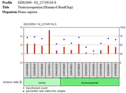 Being produced mainly in the testis of mammals, researchers believe that the protein product of TEX55 plays a role in spermatogenesis.[13] It has been shown that individuals with Cryptorchidism and Sertoli-cell-only syndrome, which are both associated with sterility, do not produce this protein in their testis.[13] Microarray analysis of individuals with Teratozoospermia, a condition that is characterized by ~96% of sperm morphology being altered, indicates that TEX55 expression is reduced by ~20%.[21][24] In clinical research, the TEX55 protein products have been detected in mice starting at 38 days old, then up regulated for at least 6 month.[13]