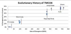 Orthologs of the TMCO6 protein have been found among sequenced organisms with the exception of invertebrates, fungi, plants and bacteria.[5] Tmco6 (transmembrane and coiled-coil domains 6) - Rat Genome Database.[9] This includes close primates to some distant fish. Graphs show the evolutionary rate of TMCO6 with respect to different species and compared to other proteins. It is concluded that TMCO6 is a fairly fast evolving protein, similar to fibrinogen.