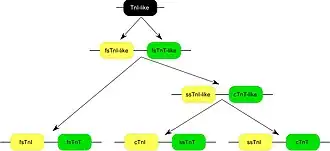 - 1 2 3 Wei B, Jin JP (Jan 2011). "Troponin T isoforms and posttranscriptional modifications: Evolution, regulation and function". Archives of Biochemistry and Biophysics. 505 (2): 144–54. doi:10.1016/j.abb.2010.10.013. PMC 3018564. PMID 20965144.