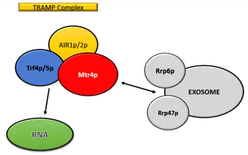 - ↑ Schmidt, Karyn; Butler, J. Scott (March 2013). "Nuclear RNA surveillance: role of TRAMP in controlling exosome specificity". Wiley Interdisciplinary Reviews: RNA. 4 (2): 217–231. doi:10.1002/wrna.1155. ISSN 1757-7012. PMC 3578152. PMID 23417976.