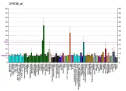 The TREM2 gene lies on the sixth chromosome in humans, specifically in location 6p21.1. The gene has 5 coding exon regions.[12][13] Alternative splicing of the TREM2 mRNA transcript leads to different isoforms of the protein being produced upon translation.[12] Specifically, TREM2 mRNA has 3 different isoforms containing 3 consistent exons, and 2 that vary between the isoforms.[14] TREM2 mRNA is most highly expressed in brain, lungs, adrenal glands, placenta, gall bladder, and colon.[12] The functions of TREM2 have been studied in mice with disruption or mutation of the mouse ortholog, Trem2.[15] TREM2 orthologs are also present in rat, dog, Rhesus monkey, macaque, chimpanzee, and other animals.[16]