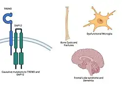 PLOSL or Nasu–Hakola disease is a neurodegenerative disorder characterized by bone cysts, dementia, and early death and is associated with variants in the TYROBP gene (encodes DAP12 protein) and TREM2 gene.[41] Bone cysts in patients with PLOSL contain fat in lieu of bone marrow.[28] In this disease, the main cell type in the brain that is affected is the microglia, where TREM2 is expressed.[58] Several recessive, inactivating mutations in TREM2 and TYROBP (encodes DAP12 protein) have been identified that can cause PLOSL.[20][59][60] The mutations prevent association between TREM2 and DAP12 or expression of shorter, non-functional forms of TREM2.[28][60] Loss of function of TREM2 signaling increases the inflammatory responses of microglia,[58] reducing clearance of dead neurons and promoting inflammation and even formation of amyloid plaques.[58]