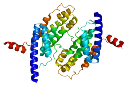 Telomeric repeat-binding factor 2 is a protein that is present at telomeres throughout the cell cycle. It is also known as TERF2, TRF2, and TRBF2, and is encoded in humans by the TERF2 gene.[5] It is a component of the shelterin nucleoprotein complex and a second negative regulator of telomere length, playing a key role in the protective activity of telomeres. It was first reported in 1997 in the lab of Titia de Lange,[6] where a DNA sequence similar, but not identical, to TERF1 was discovered, with respect to the Myb-domain. De Lange isolated the new Myb-containing protein sequence and called it TERF2.