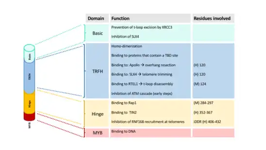 Two other domains also work to bind and influence the activity of proteins associated with the TERF2 protein. Both are unique to TERF2. The basic domain sits at the N-terminal, and has two main functions: the prevention of t-loop excision by XRCC3, and the inhibition of SLX4. The final domain of TERF2 is called the hinge domain (InterPro: IPR031902). This domain contains a motif for binding the shelterin protein TIN2, which acts as a stabilizing protein, connecting units that are attached to double stranded and single stranded DNA.[10] This domain also is responsible for binding to RAP1, and helps to inhibit RNF168 recruitment at telomeres.