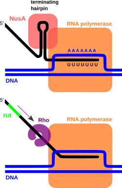 Intrinsic transcription terminators or Rho-independent terminators require the formation of a self-annealing hairpin structure on the elongating transcript, which results in the disruption of the mRNA-DNA-RNA polymerase ternary complex. The terminator sequence in DNA contains a 20 basepair GC-rich region of dyad symmetry followed by a short poly-A tract or "A stretch" which is transcribed to form the terminating hairpin and a 7–9 nucleotide "U tract" respectively. The mechanism of termination is hypothesized to occur through a combination of direct promotion of dissociation through allosteric effects of hairpin binding interactions with the RNA polymerase and "competitive kinetics". The hairpin formation causes RNA polymerase stalling and destabilization, leading to a greater likelihood that dissociation of the complex will occur at that location due to increased time spent paused at that site and reduced stability of the complex.[5][6] Additionally, the elongation protein factor NusA interacts with the RNA polymerase and the hairpin structure to stimulate transcriptional termination.[7]