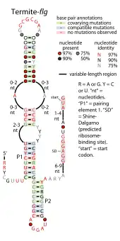 The Termite-flg RNA motif (also called tg-flg) is a conserved RNA structure identified by bioinformatics.[1][2] Genomic sequences corresponding to Termite-flg RNAs have been identified only in uncultivated bacteria present in the termite hindgut. As of 2010 it has not been identified in the DNA of any cultivated species, and is thus an example of RNAs present in environmental samples.