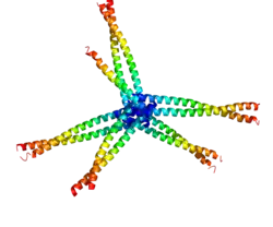 Tetherin is a type 2 integral membrane protein, with the N-terminus in the cytoplasm, one membrane spanning domain, and a C-terminus modified by the addition of a glycosyl-phosphatidylinositol (gpi) anchor.[18] The transmembrane of tetherin is predicted to be a single alpha helix. The ectodomain consists of alpha helical coiled-coil region where the coils are slightly spread apart.[19] Although Tetherin is localized to the lipid rafts on the surface of the cells, they are endocytosed to be sorted through TGN by clathrin-dependent pathway. This is mediated by AP2 binding to the dual-tyrosine motif located in the cytosolic domain of tetherin.[7] When the virion buds from the surface of the cell, one of the tetherin membrane domains is in the new viral membrane, the other remains in the plasma membrane, tethering the virion to the cell. It is antagonized by the viral protein Vpu[20] which is thought to work by targeting tetherin for degradation via the β-TrCP2 dependent pathway.[21][22]