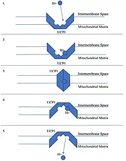 7. 1 2 Crichton PG, Lee Y, Kunji ER (2017-03-01). "The molecular features of uncoupling protein 1 support a conventional mitochondrial carrier-like mechanism". Biochimie. UCP1: 40 years and beyond. 134: 35–50. doi:10.1016/j.biochi.2016.12.016. ISSN 0300-9084. PMC 5395090. PMID 28057583.
