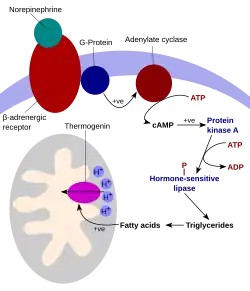 UCP1 is activated in the brown fat cell by fatty acids and inhibited by nucleotides.[6] Fatty acids are released by the following signaling cascade: Sympathetic nervous system terminals release Norepinephrine onto a Beta-3 adrenergic receptor on the plasma membrane. This activates adenylyl cyclase, which catalyses the conversion of ATP to cyclic AMP (cAMP). cAMP activates protein kinase A, causing its active C subunits to be freed from its regulatory R subunits. Active protein kinase A, in turn, phosphorylates triacylglycerol lipase, thereby activating it. The lipase converts triacylglycerols into free fatty acids, which activate UCP1, overriding the inhibition caused by purine nucleotides (GDP and ADP). During the termination of thermogenesis, thermogenin is inactivated and residual fatty acids are disposed of through oxidation, allowing the cell to resume its normal energy-conserving state.