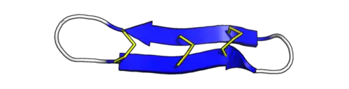 θ-defensins are cyclic peptides of 18 amino acids (~2 kDa), possessing antimicrobial activity against a range of Gram-positive and Gram-negative bacteria, fungi, and some retroviruses.[4][5][6][7] They consist of a pair of antiparallel β-sheets linked by three disulfide bonds arranged as a ladder along the sheets to form an extremely stable structure. Additionally, the peptides may self-associate into trimers.[8]