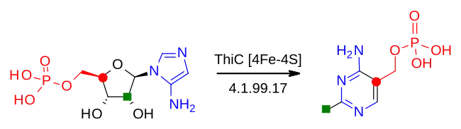 The pyrimidine ring system is formed in a reaction catalysed by phosphomethylpyrimidine synthase (ThiC), an enzyme in the radical SAM superfamily of iron–sulfur proteins, which use S-adenosyl methionine as a cofactor.[43][44]