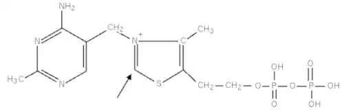 The part of TPP molecule that is most commonly involved in reactions is the thiazole ring, which contains nitrogen and sulfur. Thus, the thiazole ring is the "reagent portion" of the molecule. The C2 of this ring is capable of acting as an acid by donating its proton and forming a carbanion.[7] Normally, reactions that form carbanions are highly unfavorable, but the positive charge on the tetravalent nitrogen just adjacent to the carbanion stabilizes the negative charge, making the reaction much more favorable.[7] A compound with positive and negative charges on adjacent atoms is called an ylide, so sometimes the carbanion form of TPP is referred to as the "ylide form".[5][8]