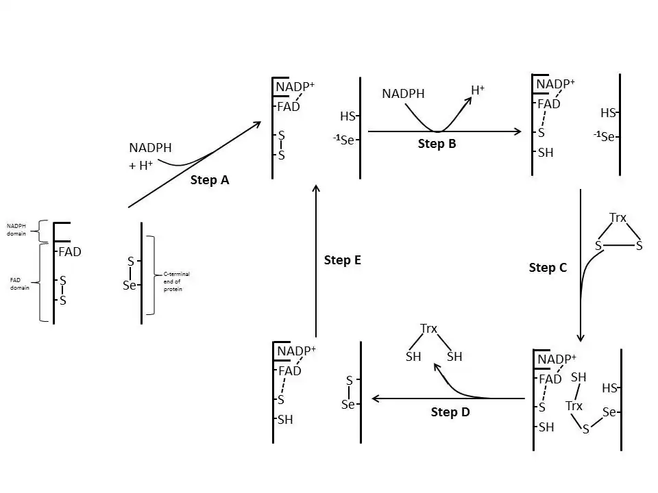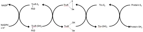 - ↑ Zhong L, Arnér ES, Holmgren A (May 2000). "Structure and mechanism of mammalian thioredoxin reductase: the active site is a redox-active selenolthiol/selenenylsulfide formed from the conserved cysteine-selenocysteine sequence". Proceedings of the National Academy of Sciences of the United States of America. 97 (11): 5854–9. Bibcode:2000PNAS...97.5854Z. doi:10.1073/pnas.100114897. PMC 18523. PMID 10801974.
