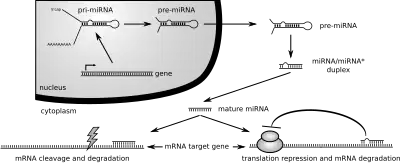 During gene expression, an mRNA molecule is transcribed from the DNA sequence and is later translated into a protein. Several regions of the mRNA molecule are not translated into a protein including the 5' cap, 5' untranslated region, 3′ untranslated region and poly(A) tail. Regulatory regions within the 3′-untranslated region can influence polyadenylation, translation efficiency, localization, and stability of the mRNA.[1][2] The 3′-UTR contains binding sites for both regulatory proteins and microRNAs (miRNAs). By binding to specific sites within the 3′-UTR, miRNAs can decrease gene expression of various mRNAs by either inhibiting translation or directly causing degradation of the transcript. The 3′-UTR also has silencer regions which bind to repressor proteins and will inhibit the expression of the mRNA.