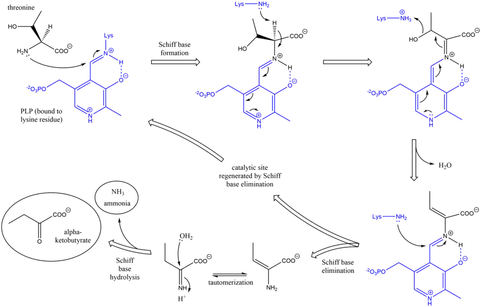The mechanism of threonine ammonia-lyase is analogous to other deaminating PLP enzymes in its use of Schiff base intermediates.[7] Initially, the amine group of threonine attacks the lysine/PLP Schiff base, displacing lysine. After deprotonation of the amino acid alpha carbon and subsequent dehydration (hence the common name threonine dehydratase), a new Schiff base is formed. This Schiff base is replaced by lysine attack, reforming the catalytically active PLP and releasing an initial alkene-containing product. This product tautomerizes, and after hydrolysis of the Schiff base, the final products are generated.[8][9] After the final alpha-ketobutyrate product is generated, isoleucine is synthesized by progressing through the intermediates alpha-acetohydroxybutyrate to alpha-beta-dihydroxy-beta-methylvalerate, then to alpha-keto-beta-methylvalerate.[10]