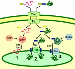 Thylakoid proteins are targeted to their destination via signal peptides and prokaryotic-type secretory pathways inside the chloroplast. Most thylakoid proteins encoded by a plant's nuclear genome need two targeting signals for proper localization: An N-terminal chloroplast targeting peptide (shown in yellow in the figure), followed by a thylakoid targeting peptide (shown in blue). Proteins are imported through the translocon of the outer and inner membrane (Toc and Tic) complexes. After entering the chloroplast, the first targeting peptide is cleaved off by a protease processing imported proteins. This unmasks the second targeting signal and the protein is exported from the stroma into the thylakoid in a second targeting step. This second step requires the action of protein translocation components of the thylakoids and is energy-dependent. Proteins are inserted into the membrane via the SRP-dependent pathway (1), the Tat-dependent pathway (2), or spontaneously via their transmembrane domains (not shown in the figure). Lumenal proteins are exported across the thylakoid membrane into the lumen by either the Tat-dependent pathway (2) or the Sec-dependent pathway (3) and released by cleavage from the thylakoid targeting signal. The different pathways utilize different signals and energy sources. The Sec (secretory) pathway requires ATP as an energy source and consists of SecA, which binds to the imported protein and a Sec membrane complex to shuttle the protein across. Proteins with a twin arginine motif in their thylakoid signal peptide are shuttled through the Tat (twin arginine translocation) pathway, which requires a membrane-bound Tat complex and the pH gradient as an energy source. Some other proteins are inserted into the membrane via the SRP (signal recognition particle) pathway. The chloroplast SRP can interact with its target proteins either post-translationally or co-translationally, thus transporting imported proteins as well as those that are translated inside the chloroplast. The SRP pathway requires GTP and the pH gradient as energy sources. Some transmembrane proteins may also spontaneously insert into the membrane from the stromal side without energy requirement.[29]