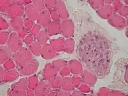 Muscle cells (myocytes) form the active contractile tissue of the body. Muscle tissue functions to produce force and cause motion, either locomotion or movement within internal organs. Muscle is formed of contractile filaments and is separated into three main types; smooth muscle, skeletal muscle and cardiac muscle. Smooth muscle has no striations when examined microscopically. It contracts slowly but maintains contractibility over a wide range of stretch lengths. It is found in such organs as sea anemone tentacles and the body wall of sea cucumbers. Skeletal muscle contracts rapidly but has a limited range of extension. It is found in the movement of appendages and jaws. Obliquely striated muscle is intermediate between the other two. The filaments are staggered and this is the type of muscle found in earthworms that can extend slowly or make rapid contractions.[5] In higher animals striated muscles occur in bundles attached to bone to provide movement and are often arranged in antagonistic sets. Smooth muscle is found in the walls of the uterus, bladder, intestines, stomach, oesophagus, respiratory airways, and blood vessels. Cardiac muscle is found only in the heart, allowing it to contract and pump blood through the body.