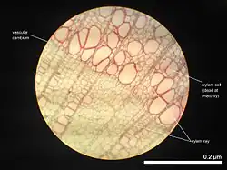 Xylem (Greek, xylos = wood) serves as a chief conducting tissue of vascular plants. It is responsible for the conduction of water and inorganic solutes. Xylem consists of four kinds of cells: