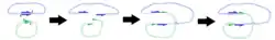 At recombination, two directly repeated res sites with resolvase dimers bound to each sub-site, come together to form a large complex structure called the synaptosome. Resolvase bound to sites II and III initiates the assembly of this complex. In this structure, exact architecture of which is still unclear, two res sites are intertwined in such a way as to juxtapose two copies of site I, allowing resolvase dimers bound to each site to form a tetramer. Again, it is the interaction between the resolvase dimers bound at accessory sites (sites II and III) and resolvase at site I that causes the two dimers to synapse and form a tetramer. After the tetramer is formed it becomes activated and the top and bottom DNA strands are simultaneously cleaved in the middle of the site I with a 2bp overhang. The strand exchange ensues by as yet unknown mechanism with a resulting net rotation of 180°. The strand exchange is then followed by the religation (Stark et al., 1992). Recombination between two directly repeated res sites separates, or resolves, the "cointegrate" into two original molecules, each one now containing a copy of the Tn3 transposon. After resolution these two molecules remain linked as a simple two-noded catenane which can be easily separated in vivo by a type II topoisomerase (Grindley 2002). Wild type resolvase system absolutely requires a supercoiled substrate and that the recombination sites are oriented in a direct repeat on the same DNA molecule. However, a number of "deregulated" or "hyperactive" mutants that have lost the requirement for the accessory sites have been isolated. These mutants are capable of catalysing recombination between two copies of site I only, which basically reduces the recombination site size from 114bp to only 28bp.[4][5] Furthermore, these mutants have no supercoiling or connectivity requirements (Arnold et al., 1999) and have been shown to work in mammalian cells.[6] Hyperactive resolvase mutants have so far proven useful in creating resolvases with altered sequence specificity[7] but also in structural work.[8]