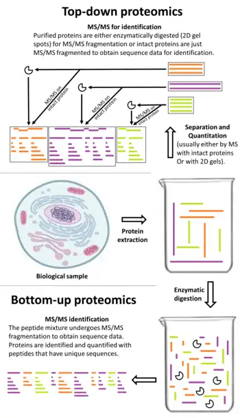 - Top-down proteomics interrogation can overcome problems for identifying individual proteins, but has not been achieved on a large scale due to a lack of intact protein fractionation methods that are integrated with tandem mass spectrometry.[7]