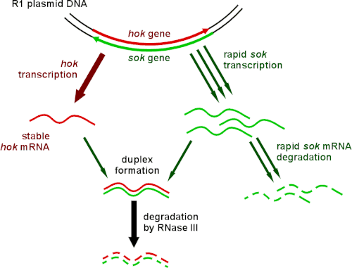 - ↑ Wu K, Jahng D, Wood TK (1994). "Temperature and growth rate effects on the hok/sok killer locus for enhanced plasmid stability". Biotechnology Progress. 10 (6): 621–9. doi:10.1021/bp00030a600. PMID 7765697. S2CID 34815594.