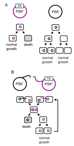 - ↑ Cooper TF, Heinemann JA (November 2000). "Postsegregational killing does not increase plasmid stability but acts to mediate the exclusion of competing plasmids". Proceedings of the National Academy of Sciences of the United States of America. 97 (23): 12643–8. Bibcode:2000PNAS...9712643C. doi:10.1073/pnas.220077897. PMC 18817. PMID 11058151.