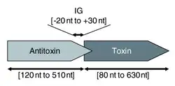 Toxin-antitoxin systems are typically classified according to how the antitoxin neutralises the toxin. In a type I toxin-antitoxin system, the translation of messenger RNA (mRNA) that encodes the toxin is inhibited by the binding of a small non-coding RNA antitoxin that binds the toxin mRNA. The toxic protein in a type II system is inhibited post-translationally by the binding of an antitoxin protein. Type III toxin-antitoxin systems consist of a small RNA that binds directly to the toxin protein and inhibits its activity.[6] There are also types IV, V and VI, which are less common.[7] Toxin-antitoxin genes are often inherited through horizontal gene transfer[8][9] and are associated with pathogenic bacteria, having been found on plasmids conferring antibiotic resistance and virulence.[1]