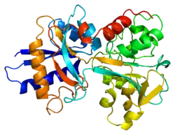 - 1 2 3 MacGillivray RT, Moore SA, Chen J, Anderson BF, Baker H, Luo Y, et al. (June 1998). "Two high-resolution crystal structures of the recombinant N-lobe of human transferrin reveal a structural change implicated in iron release". Biochemistry. 37 (22): 7919–28. doi:10.1021/bi980355j. PMID 9609685.