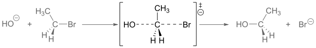 As an example, the transition state shown below occurs during the SN2 reaction of bromoethane with a hydroxide anion:
