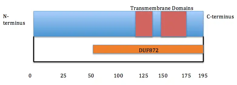 The protein is encoded by TMEM134 gene and is 195 amino acids in length. The protein contains two transmembrane domains but does not contain a signal peptide. This suggests that there is an internal signal peptide upstream of the translated portion of the protein. The protein is overall considering normal with its amino acid content but does have two regions of high hydrophobicity, which occur during the transmembrane regions of the protein. This gives the protein an isoelectric point of 6.08. The overall weight of the protein is 21.6 kilodaltons, which is conserved throughout the different orthologs. The protein also contains a domain of unknown function 872 (DUF872). Currently there is no thought to the possible function of this domain.