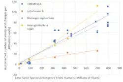 Transmembrane protein 151A has one paralogue: TMEM151B which has a 50.76% identity with TMEM151A. It is hypothesized that TMEM151A first arose as a gene duplicate of TMEM151B approximately 320 Million Years Ago in reptiles. TMEM151A is evolving at approximately the same rate as Hemoglobin B.[39][40]