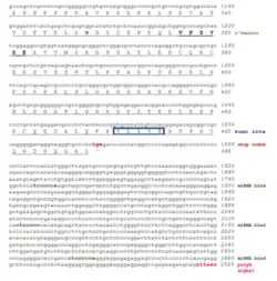 The secondary structure of the protein is predicted to consist of approximately alpha helices and beta sheets (the exact location and number of which depend on the program which is used for the prediction) but no coiled coils.[8][9][10] Diagrams of the predicted tertiary structure and transmembrane domains[11] are to the right.