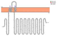 The protein has a length of 566 amino acids and contains two transmembrane domains.[6] According to Compute pI/Mw, molecular weight of approximately 61 kDa, which matches the weight listed on NCBI, and a theoretical isoelectric point of 6.72.[11][6] The human TMEM151B protein composition is poor in lysine and arginine, lysine comprising 1.4% of the amino acids and arginine making up 0.8% of the total protein. The mouse ortholog is also arginine poor.[12]