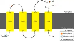 The protein is predicted to be post-translationally modified by phosphorylation and glycosylation.[19] The protein is predicted to have four transmembrane domains in the nuclear membrane. The structure of the protein is predicted to be helical in the transmembrane domains.[20][21][22] Disulfide bonds are predicted to be found in the region in between transmembrane domains 3 and 4, which indicates that this particular region is located in the nucleoplasm.[23][24][25][26]