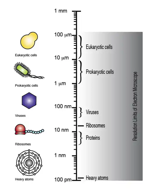 The electron microscope has the capacity to obtain a resolution of up to 100 pm, whereby microscopic biomolecules and structures such as viruses, ribosomes, proteins, lipids, small molecules and even single atoms can be observed.[8]