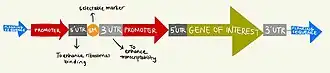 The first requirement for transplastomic plant generation is to have a suitable gene construct that can be introduced into a plastid like a chloroplast in the form of an E. coli plasmid vector.[8] There are several key features of a suitable gene cassette including but not limited to (1) selectable marker (2) flanking sequences (3) gene of interest (4) promoter sequences (5) 5' UTR (6) 3' UTR (7) intercistronic elements.[9] The selectable marker typically tends to be an antibiotic resistant gene, which would give the plant cell the ability to tolerate being grown on antibiotic containing agar plates.[5] Flanking sequences are crucial for introduction of the gene construct at precise predetermined points of the plastid genome through homologous recombination.[4] The gene of interests introduced have many different applications and can range from pest resistance genes to vaccine antigen production.[4] Intercistronic elements (IEE) are important for facilitating high levels of gene expression if multiple genes are introduced in the form of an operon.[4] Finally, the 5' UTR and 3' UTR enhances ribosomal binding and increases transcript stability respectively.[4]