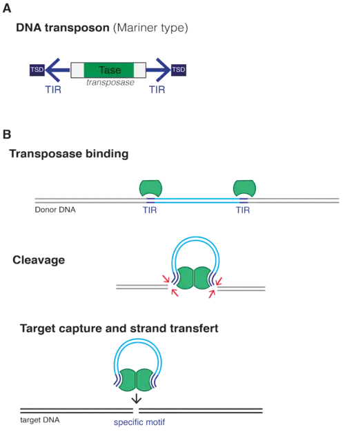- ↑ Plasterk RH, Izsvák Z, Ivics Z (August 1999). "Resident aliens: the Tc1/mariner superfamily of transposable elements". Trends in Genetics. 15 (8): 326–32. doi:10.1016/S0168-9525(99)01777-1. PMID 10431195.