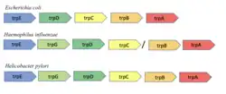 - ↑ Merino E, Jensen RA, Yanofsky C (April 2008). "Evolution of bacterial trp operons and their regulation". Current Opinion in Microbiology. 11 (2): 78–86. doi:10.1016/j.mib.2008.02.005. PMC 2387123. PMID 18374625.