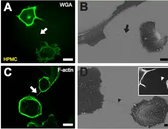 A tunneling nanotube (TNT) or membrane nanotube is a term that has been applied to cytoskeletal protrusions that extend from the plasma membrane which enable different animal cells to connect over long distances, sometimes over 100 μm between certain types of cells.[2][3][4] Tunneling nanotubes that are less than 0.7 micrometers in diameter, have an actin structure and carry portions of plasma membrane between cells in both directions. Larger TNTs (>0.7 μm) contain an actin structure with microtubules and/or intermediate filaments, and can carry components such as vesicles and organelles between cells, including whole mitochondria.[5][6][7] The diameter of TNTs ranges from 0.05 μm to 1.5 μm and they can reach lengths of several cell diameters.[7][8] There have been two types of observed TNTs: open ended and closed ended. Open ended TNTs connect the cytoplasm of two cells. Closed ended TNTs do not have continuous cytoplasm as there is a gap junction cap that only allows small molecules and ions to flow between cells.[9] These structures have shown involvement in cell-to-cell communication, transfer of nucleic acids such as mRNA and miRNA between cells in culture or in a tissue, and the spread of pathogens or toxins such as HIV and prions.[10][11][12][13][14][3] TNTs have observed lifetimes ranging from a few minutes up to several hours, and several proteins have been implicated in their formation and inhibition, including many that interact with Arp2/3.[15][16]