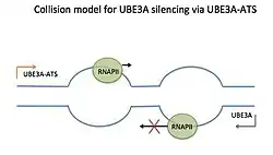 Both copies of the UBE3A gene are active in most of the body's tissues. In most neurons, however, only the copy inherited from a person's mother (the maternal copy) is normally active; this is known as paternal imprinting. Recent evidence shows that at least some glial cells and neurons may exhibit biallelic expression of UBE3A.[5][6] Further work is thus needed to delineate a complete map of UBE3A imprinting in humans and model organisms such as mice. Silencing of Ube3a on the paternal allele is thought to occur through the Ube3a-ATS part of a lincRNA called "LNCAT"[7] (Large Non-Coding Antisense Transcript).