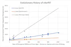 The c4orf47 gene has been evolving at a relatively slow rate when compared to the evolutionary rates of Fibrinogen Alpha and Cytochrome C. This suggests there is a conserved function for the encoded protein.